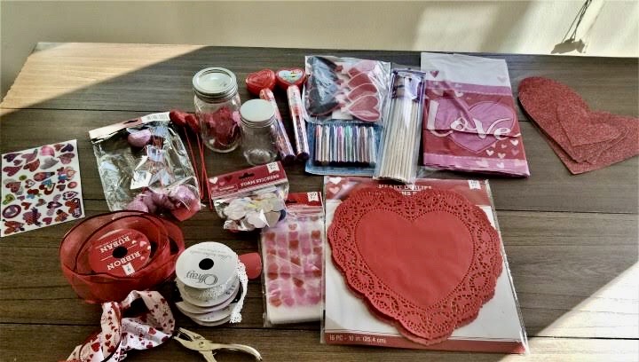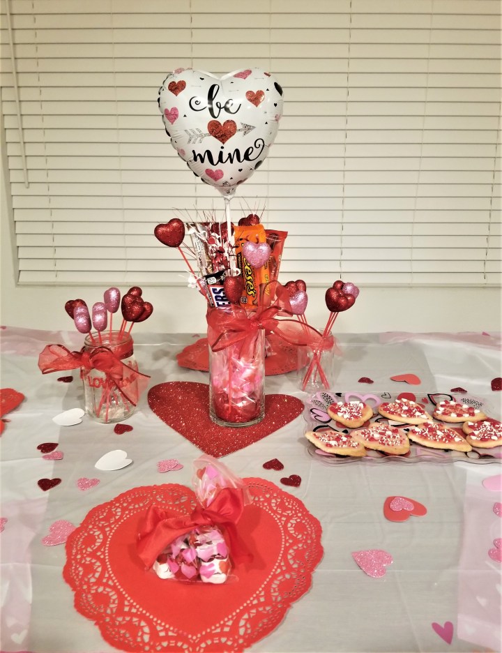 With sparkly red tulle, red & pink glitter hearts, heart sticks, glitter card stock paper, heart doilies, textured red ribbon, plastic or cloth table-cover, heart foams, fake roses, 2 mason jars, Valentine stick balloon, balloon weight or cellophane, fun centerpiece (fake rose ball, candied vase, or fresh flowers), you can host a fabulous Valentine’s Day party, too!