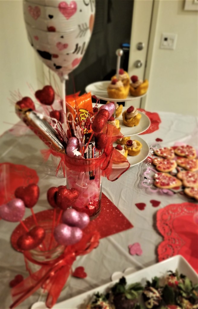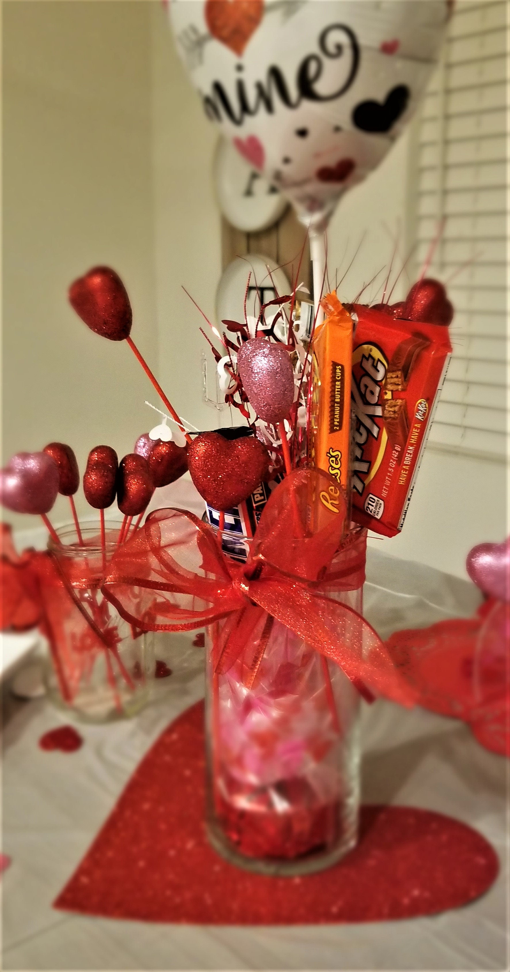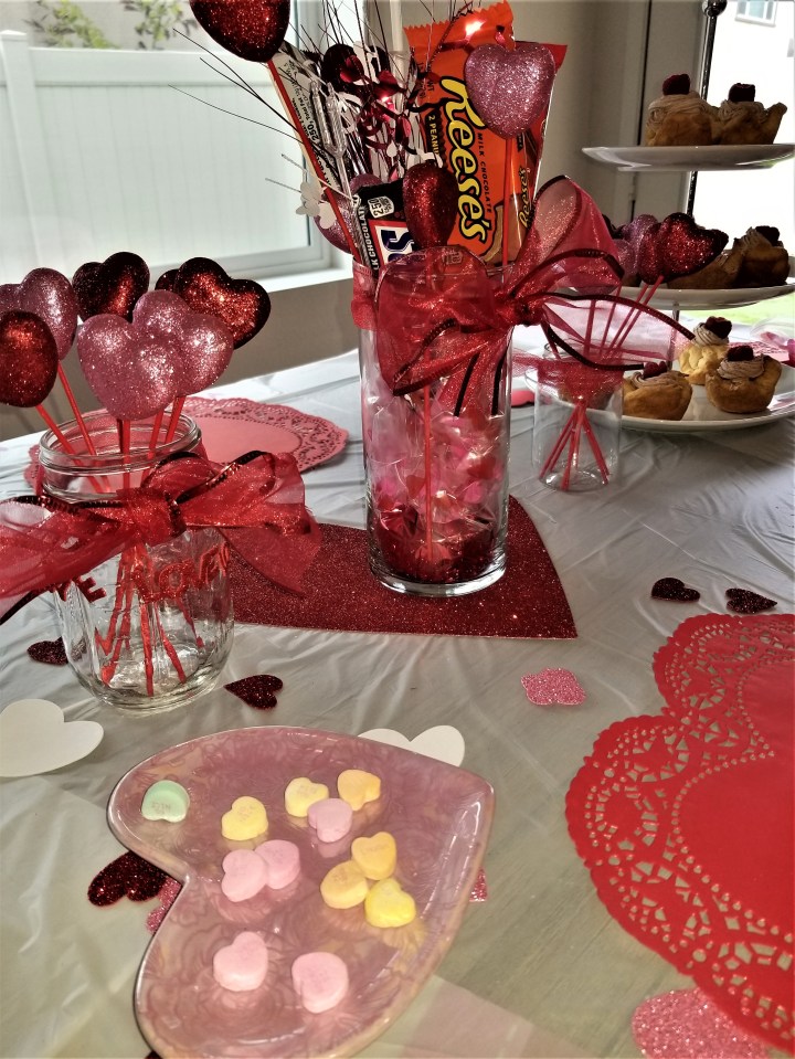 Once the center piece is completed, use heart doilies as place mats, create a Valentine banner by cutting heart shapes with glitter stock paper and stringing it together with skinny red ribbon. Decorate 2 mason jars with accent heart decals & use heart sticks to dress-up the jars. Bake some delicious Valentine’s Day desserts. ❤️ Place them on decorative plates and sprinkle your table with conversation hearts or foam glitter hearts.