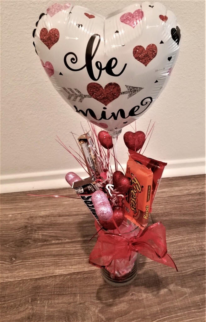If you’re having a kids party, a candied vase would be another sweet touch. You’ll need a vase, Valentine stick balloon, red ribbon, cellophane, glittered heart sticks, 5 plastic or wooden sticks, 4-5 chocolate bars of choice, and tape. Tape the chocolate bars on each of the plastic or wooden sticks, add the cellophane or a balloon weight, next the Valentine stick balloon, and finish it with the red ribbon around the vase. Voila, your candied vase is complete!
