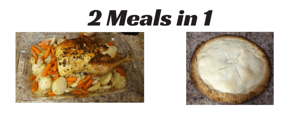 For busy families on the go the idea of 2 meals in 1 are great savers of time and money! This was one of those hectic weeks where planning ahead for meals was an absolute necessity or we would have spent too much money eating out. These dishes are perfect for those weeks that are filled with lots of activities. After preparing the roasted chicken, the left-over chicken can be used for a pot-pie (recipe included), salad, tacos, or sandwiches …