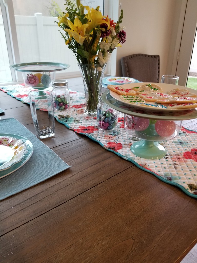 1) Start by adding a colorful table runner.