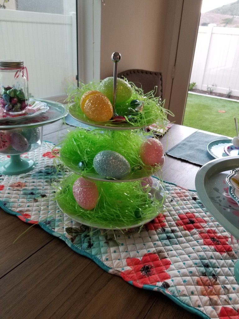 5) Add dimension to your table by adding Easter tiers and platters and colorful glittery Easter Eggs.