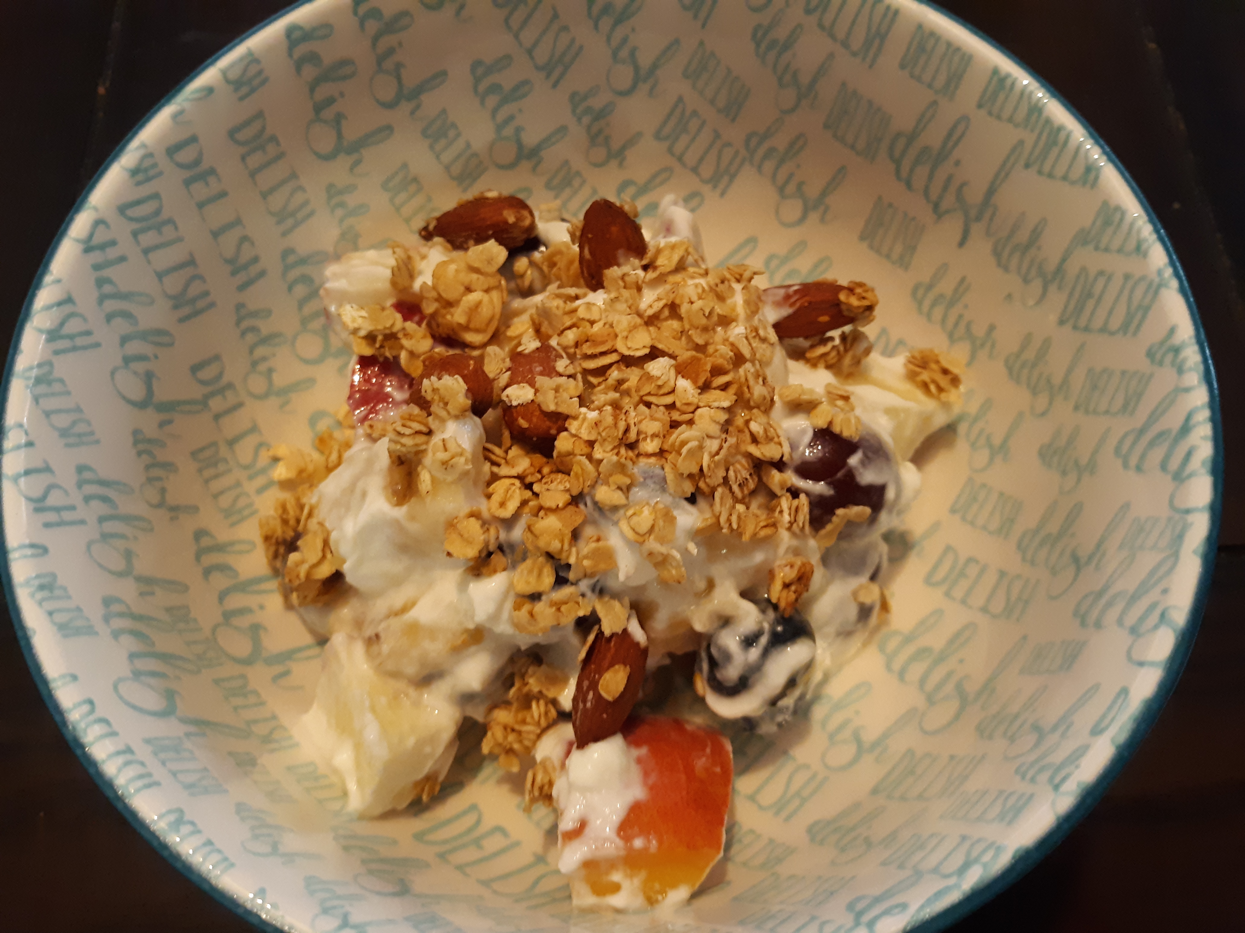 - Take chopped fruit and place in a serving bowl, add 1 tsp.of greek yogurt, and 1 tsp. of honey and stir. Sprinkle granola topping on top of fruit parfait.